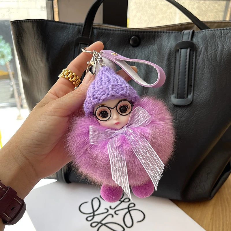 Porte-clés pompon de poupée à grands yeux, breloque de sac en vraie fourrure de renard pour femmes, accessoires de bijoux fins, cadeau pour enfants filles
